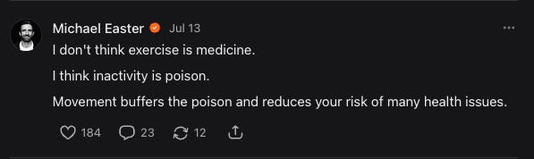 This chat was prompted by me posting that exercise isn’t medicine so much as inactivity is poison. Given your exercise physiology background, how was the idea of exercise and health talked about when you were doing your academic work?