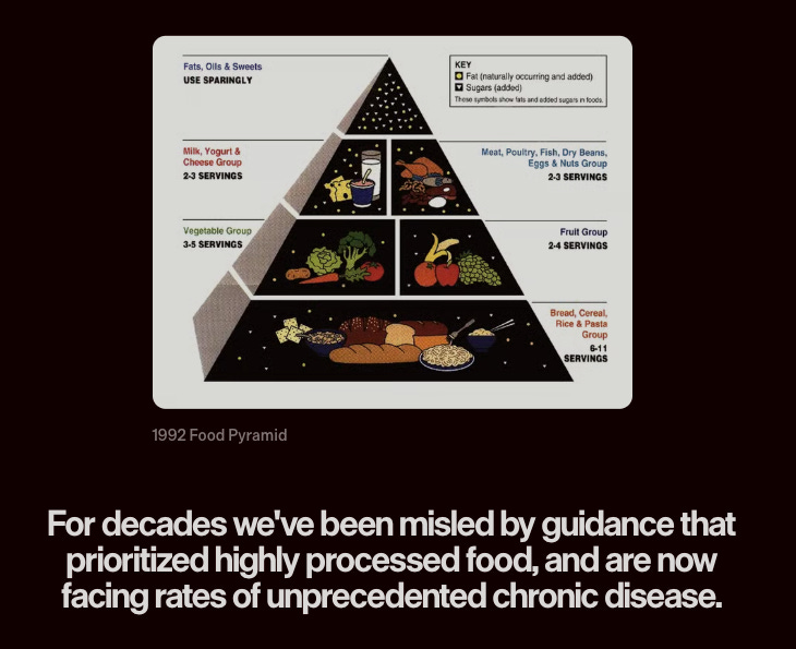 RFK Jr. and others have been highly critical of the old pyramid. The new realfood.gov website presents it as a root cause of America’s health problems. From the website: