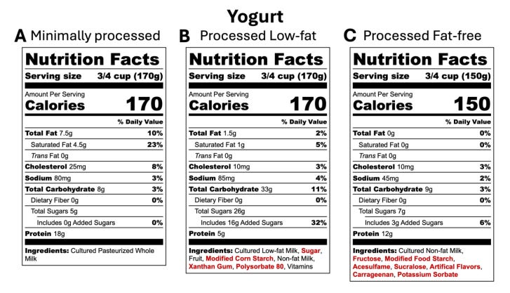 To make their case for full-fat dairy, the report compares three yogurt labels: