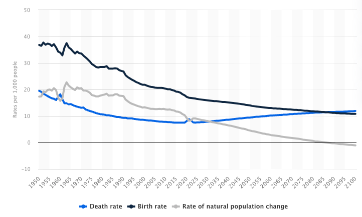The year the global birth rate is expected to intersect with the global death rate, leading to a net zero world population growth.